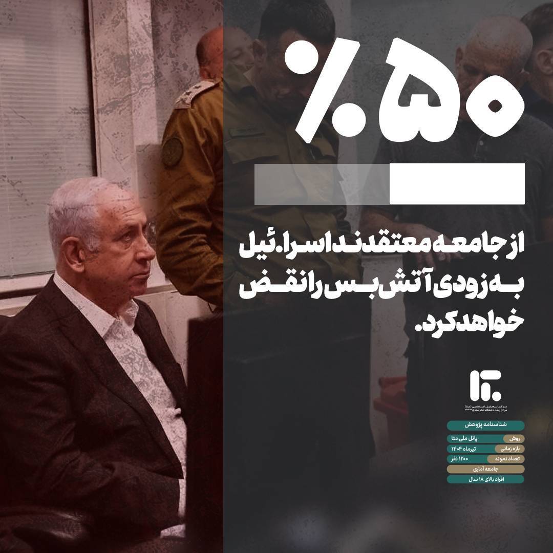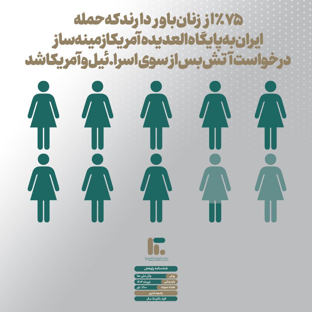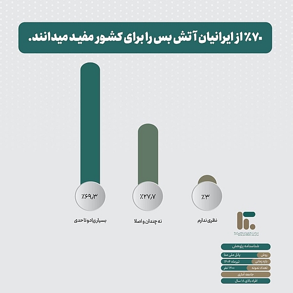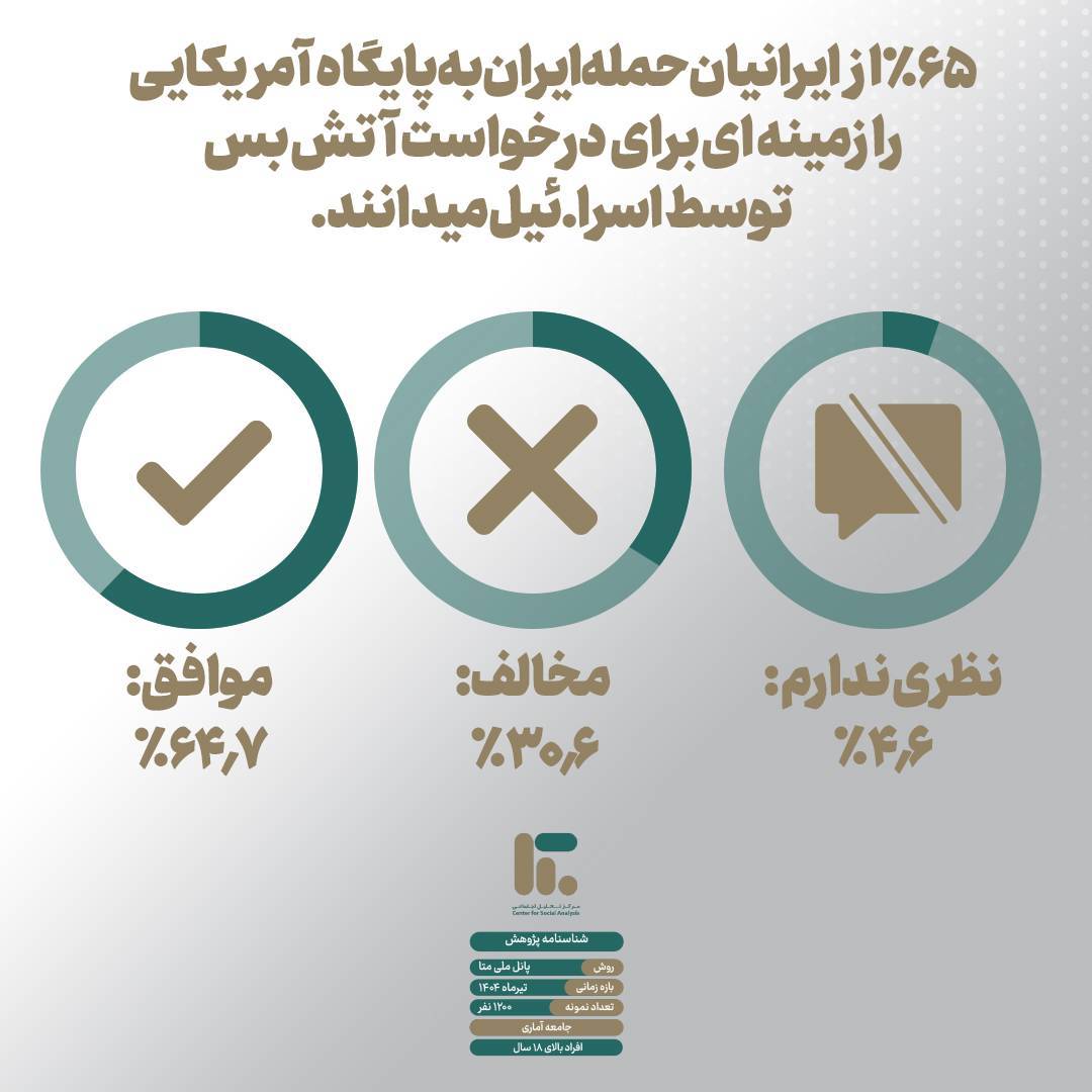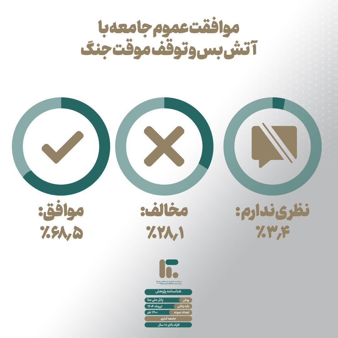 بر اساس داده‌های پانل ملی متا در تیر ماه ۱۴۰۴ و پس از توقف جنگ ۱۲ روزه، بیش از ۶۹ درصد مردم ایران آتش‌بس و توقف جنگ را برای کشور مفید ارزیابی کرده‌اند.