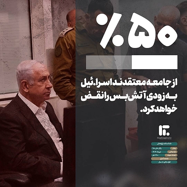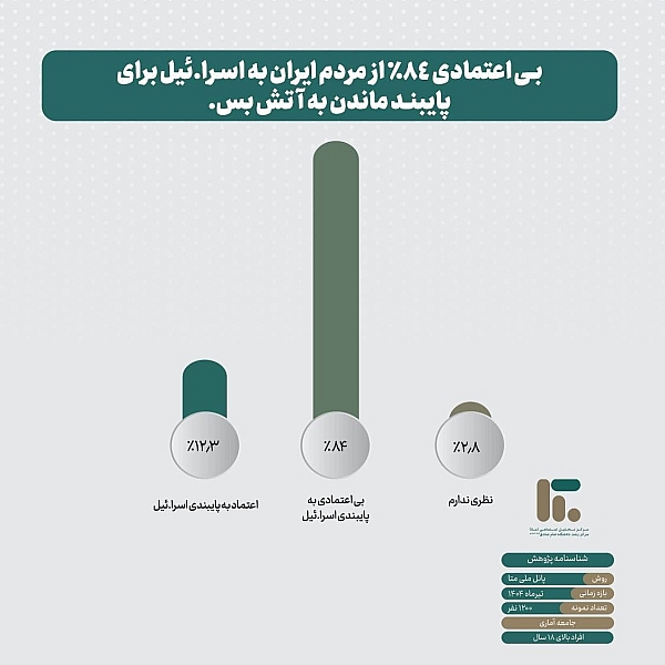 اما از سوی دیگر، ۸۴ درصد مردم به پایبندی اسرائیل به آتش‌بس، بی‌اعتماد هستند؛ بی‌اعتمادی‌ای گسترده که نشان می‌دهد مردم، در عین پذیرش آتش‌بس به‌عنوان یک تصمیم صحیح، همچنان به اسرائیل بی اعتمادند و نسبت به نیت واقعی طرف مقابل تردید دارند.