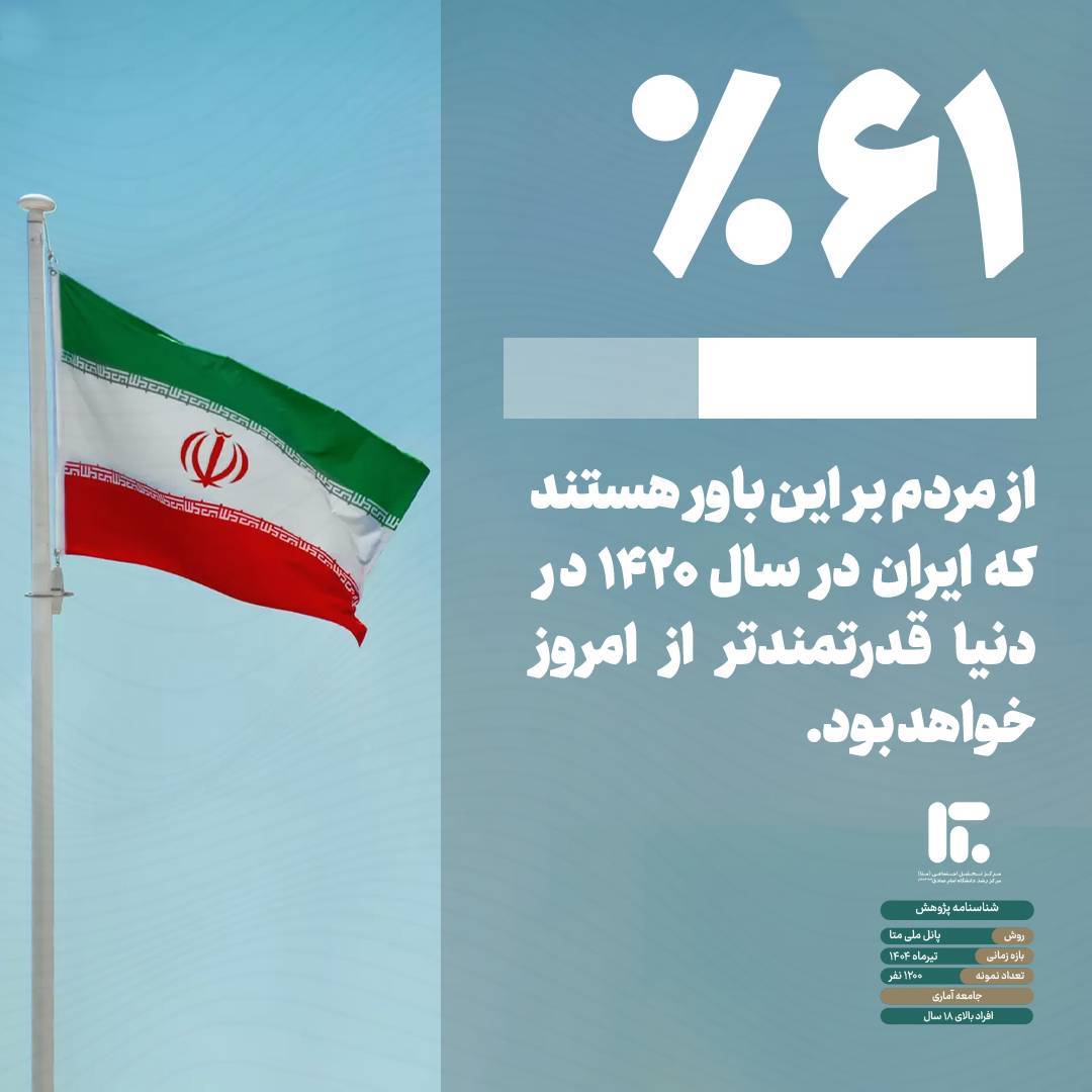 بر اساس پیمایش مرکز تحلیل اجتماعی (متا) در تیرماه ۱۴۰۴ و پس از دوران جنگ میان ایران و اسرائیل، ۶۱ درصد از مردم جامعه، ایران را در سال ۱۴۲۰ قدرتمند از امروز می‌دانند.