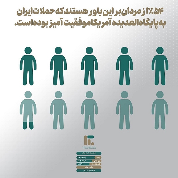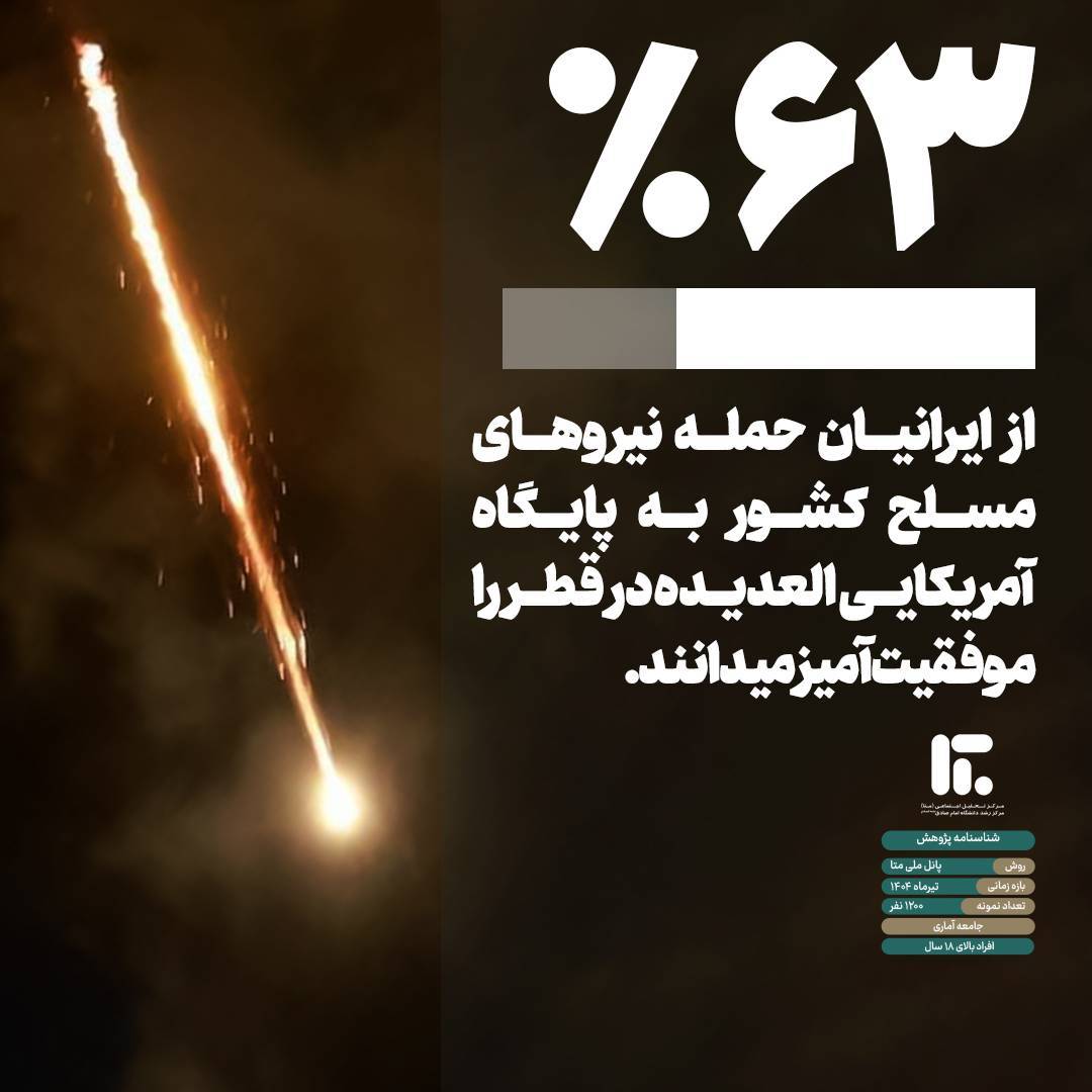 🔹 ۶۳ درصد از مردم، حمله به پایگاه آمریکایی العدیده در قطر را موفقیت‌آمیز ارزیابی کرده‌اند؛ اقدامی که از دیدگاه بیش از ۶۰ درصد ایرانیان، یکی از عوامل مؤثر در درخواست آتش‌بس توسط اسرائیل تلقی شده است؛ به‌گونه‌ای که ۶۴.۷ درصد از پاسخ‌دهندگان معتقدند که این حمله، زمینه‌ای برای درخواست آتش‌بس بوده‌است.