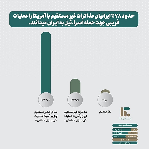🔹همچنین، حدود ۷۸٪ از ایرانیان، مذاکرات غیرمستقیم ایران و آمریکا را نوعی عملیات فریب برای زمینه‌سازی حمله اسرائیل به ایران ارزیابی می‌کنند.