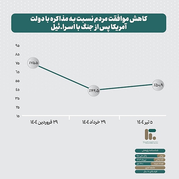🔻 مقایسه نتایج این بررسی، نشان می‌دهد که میزان موافقت مردم با مذاکره با دولت آمریکا، طی کمتر از سه ماه حدود ۳۰ درصد کاهش یافته است؛ این تغییر نگرش عمومی، می‌تواند بازتابی از مشارکت و حمله مستقیم آمریکا در جنگ اخیر باشد.